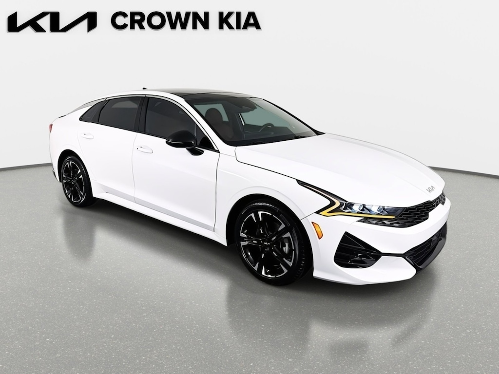 This 2024 Kia K5 GT-Line in Glacial White Pearl features: 4-Wheel Disc Brakes, 6 Speakers, ABS brakes, Air Conditioning, Alloy wheels, AM/FM radio: SiriusXM, Apple CarPlay & Android Auto, Auto High-beam Headlights, Automatic temperature control, Brake assist, Bumpers: body-color, Carpeted Floor Mats, Cloth/SynTex Seat Trim, Delay-off headlights, Driver door bin, Driver vanity mirror, Dual front impact airbags, Dual front side impact airbags, Electronic Stability Control, Forward Collision Avoidance-Assist, Four wheel independent suspension, Front anti-roll bar, Front Bucket Seats, Front Center Armrest, Front dual zone A/C, Front fog lights, Front reading lights, Fully automatic headlights, GT-Line Panoramic Sunroof Package, GT-Line Premium Package, GT-Line Red Interior Package, Heated door mirrors, Heated Front Bucket Seats, Heated front seats, Highway Driving Assist, Illuminated entry, Knee airbag, Leather steering wheel, LED Interior Lighting, LED Projection Headlamps, Low tire pressure warning, Navigation System, Occupant sensing airbag, Outside temperature display, Overhead airbag, Overhead console, Panic alarm, Panoramic Sunroof, Passenger door bin, Passenger vanity mirror, Power door mirrors, Power driver seat, Power steering, Power windows, Radio data system, Radio: AM/FM/MP3 Audio System, Rear anti-roll bar, Rear seat center armrest, Rear side impact airbag, Rear window defroster, Remote keyless entry, Security system, Smart Cruise Control w/Stop & Go, Speed control, Speed-sensing steering, Split folding rear seat, Spoiler, Sport steering wheel, Steering wheel mounted audio controls, Tachometer, Telescoping steering wheel, Tilt steering wheel, Traction control, Trip computer, Turn signal indicator mirrors, Variably intermittent wipers, Wheels: 18" Gloss Black Machined Finish Alloy. 27/37 City/Highway MPG