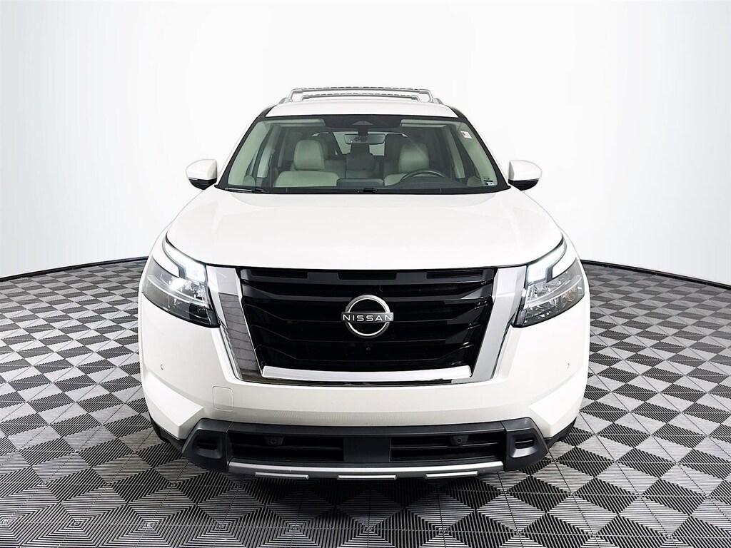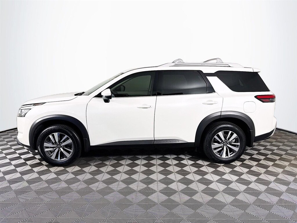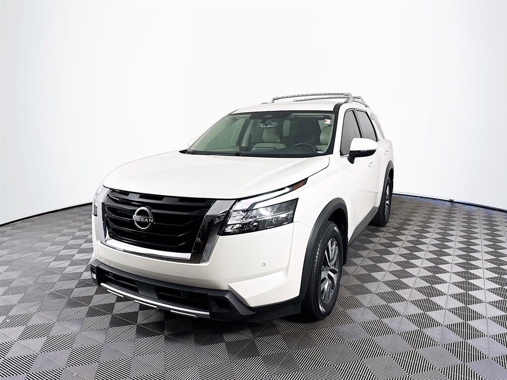 This 2024 Nissan Pathfinder SL in Pearl White Tricoat features: **CROWN CONFIDENCE PLAN USED CAR GUARANTEE Certified, 3rd row seats: bench, 4-Wheel Disc Brakes, 6 Speakers, ABS brakes, Air Conditioning, Alloy wheels, AM/FM radio: SiriusXM, Auto High-beam Headlights, Auto-dimming Rear-View mirror, Automatic temperature control, Axle Ratio: 4.334, Bench Seat Carpeted Floor Mats (Set of 4), Black Splash Guards (Set of 4), Brake assist, Bumpers: body-color, Cross Bars, Delay-off headlights, Driver door bin, Driver vanity mirror, Dual front impact airbags, Dual front side impact airbags, Electronic Stability Control, Emergency communication system, Exterior Parking Camera Rear, Four wheel independent suspension, Front anti-roll bar, Front Bucket Seats, Front Center Armrest, Front dual zone A/C, Front reading lights, Fully automatic headlights, Garage door transmitter: HomeLink, Heated door mirrors, Heated Front Bucket Seats, Heated front seats, Heated steering wheel, Illuminated entry, Knee airbag, Leather steering wheel, Leather-Appointed Seating Surfaces, Low tire pressure warning, Navigation system: NissanConnect with Navigation and Services, Nissan USB Charging Cable Set, NissanConnect featuring Apple CarPlay and Android Auto, NissanConnect w/Navigation & Services, Occupant sensing airbag, Outside temperature display, Overhead airbag, Overhead console, Panic alarm, Passenger door bin, Passenger vanity mirror, Power door mirrors, Power driver seat, Power Liftgate, Power passenger seat, Power steering, Power windows, Radio data system, Radio: AM/FM Audio System, Rear air conditioning, Rear anti-roll bar, Rear reading lights, Rear seat center armrest, Rear side impact airbag, Rear window defroster, Rear window wiper, Reclining 3rd row seat, Remote keyless entry, Security system, Speed control, Speed-sensing steering, Split folding rear seat, Spoiler, Steering wheel mounted audio controls, Tachometer, Telescoping steering wheel, Tilt steering wheel, Traction control, Trip computer, Turn signal indicator mirrors, Variably intermittent wipers, Wheels: 18" x 8J Machined Alloy. Certified. Clean CARFAX. 20/27 City/Highway MPG