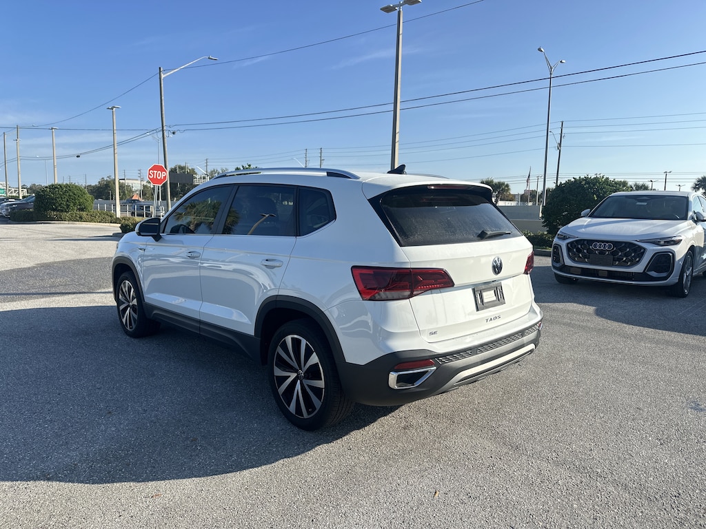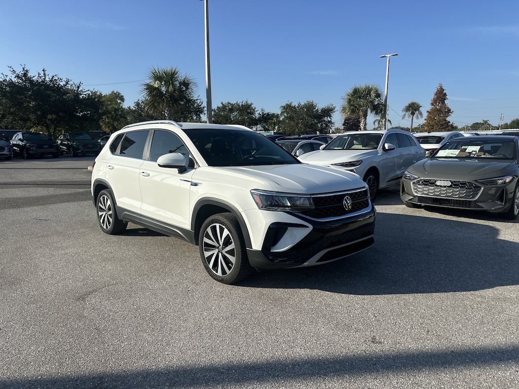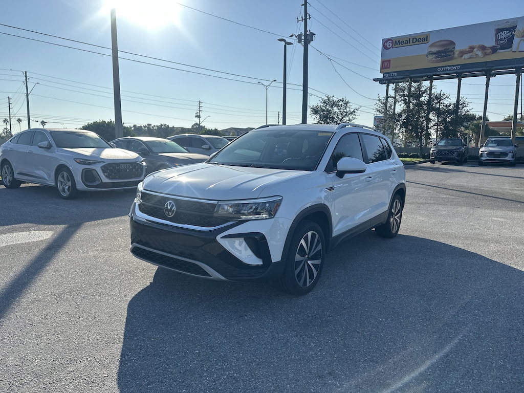 This 2023 Volkswagen Taos SE combines efficiency, versatility, and modern technology in a compact SUV thats easy to drive and loaded with premium features. Finished in Pure White with a Black Leatherette & Cloth interior, it offers a clean, modern look paired with excellent build quality and impressive fuel economyup to 36 MPG highway.