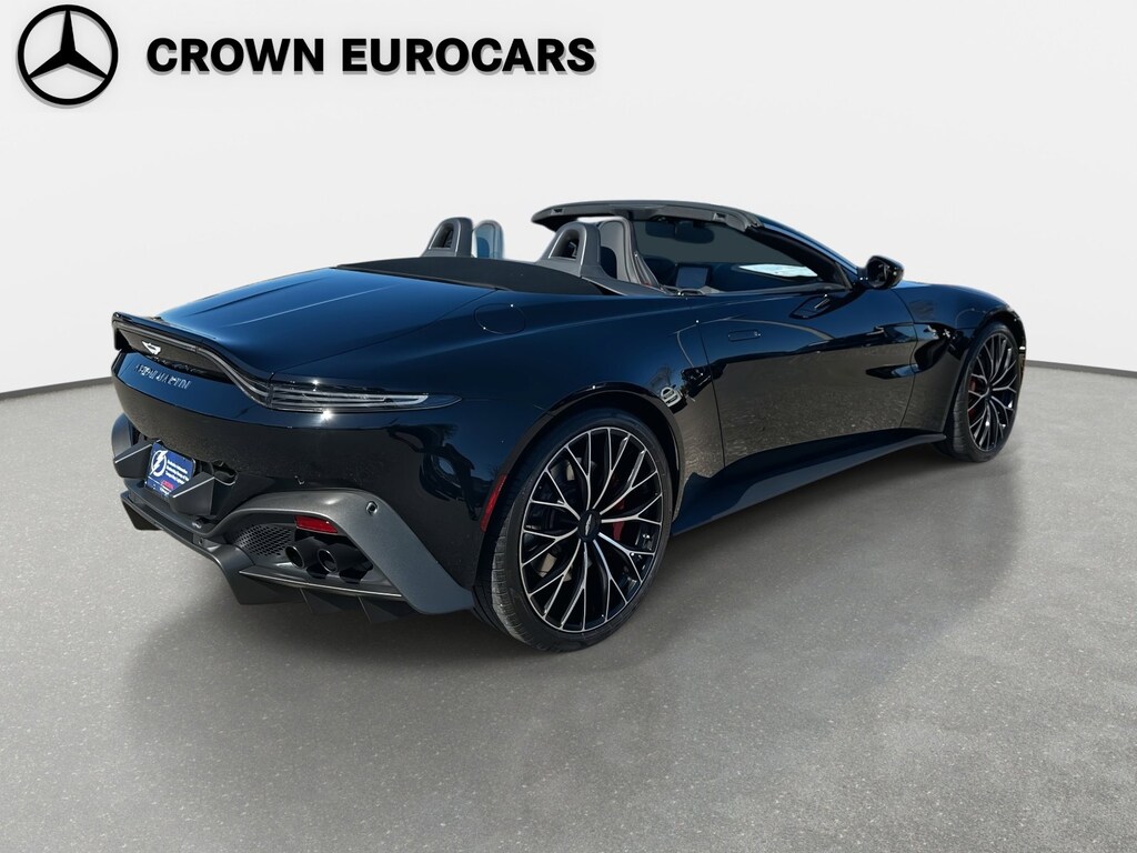 Power comes from a twin-turbocharged 4.0-liter V8 paired with an automatic transmission driving the rear wheels. The car features Aston Martins adaptive chassis tuning, selectable drive modes, and a sport exhaust system, delivering the signature Vantage driving experience with the added drama of a power-operated soft top.
